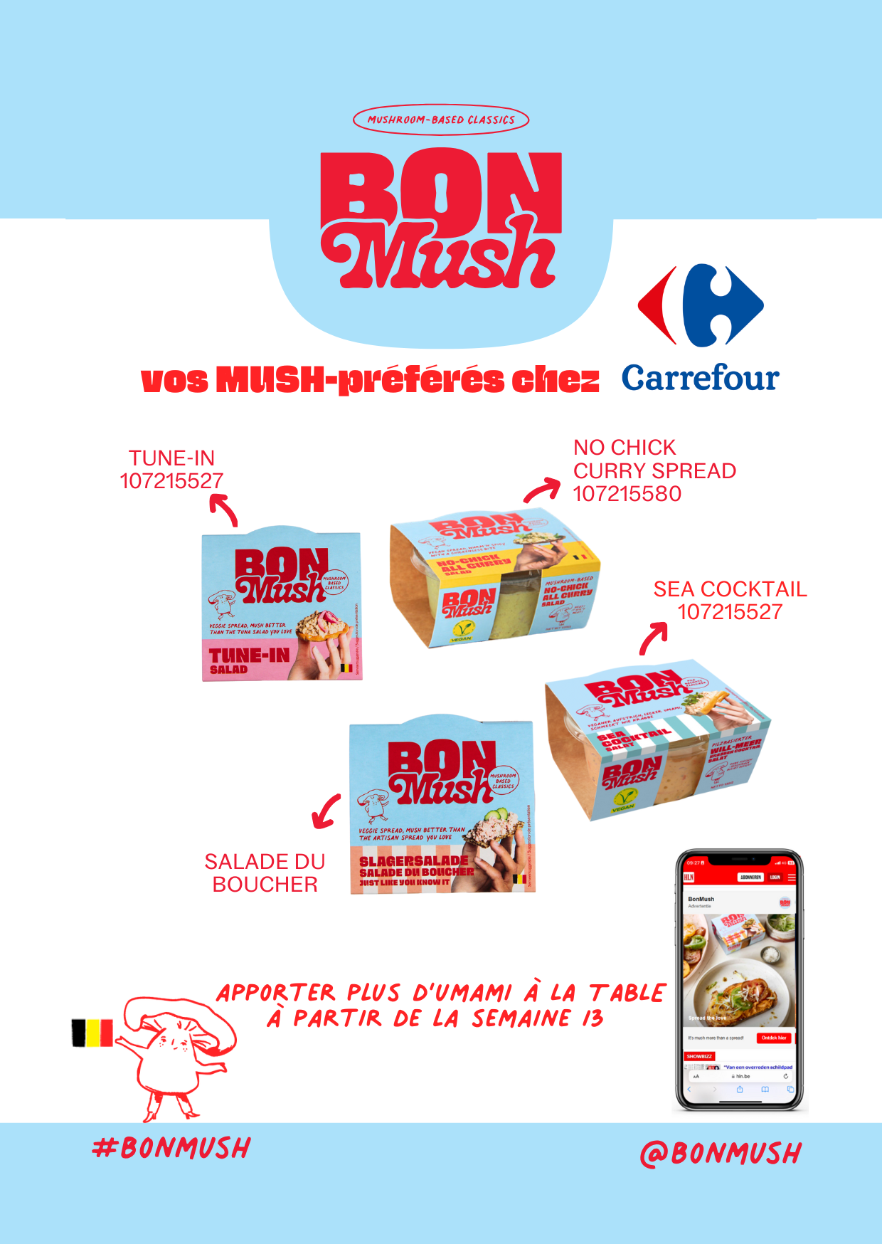 Bonmush met le pleurote à l'honneur. Dans notre cuisine belge (Ypres), nous créons des produits à tartiner qui prouvent que le végétal peut aussi être vraiment délicieux. Durable, local et étonnamment polyvalent. 4 salades à tartiner sont récemment entrées dans l'assortiment de Carrefour : le sea cocktail, le